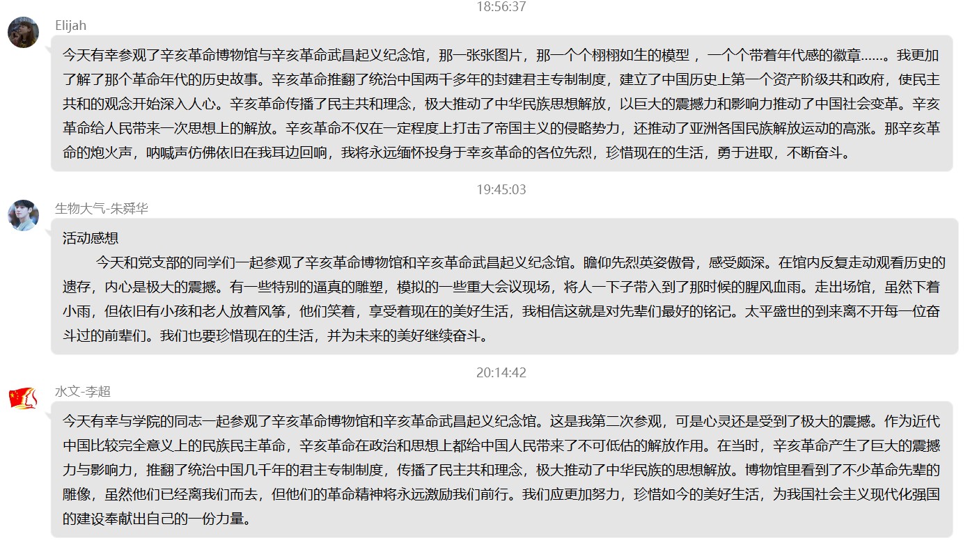 水文专业大学生党支部的李超同志说:博物馆里看到了不少革命先辈的雕像,虽然他们已经离我们而去,但他们的革命精神将永远激励我们前行。我们应更加努力,珍惜如今的美好生活,为我国社会主义现代化强国的建设奉献出自己的一份力量。