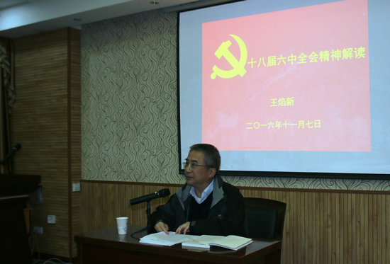 王焰新校长结合自身研读思考,运用 “1个新提法”、“1个时间表”、“2个重要文件”、“11个坚决”、“8个不允许”、“6个不准”等关键数字法对《十八届六中全会公报》进行了全面解读,让大家对党的十八届六中全会的基本情况和深远重大意义有了全面系统深刻认识。