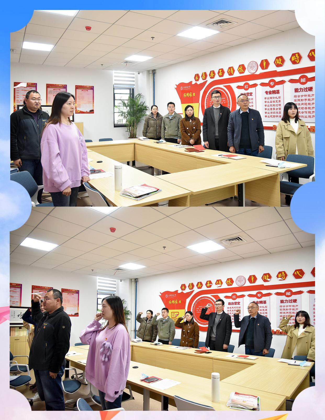 支部党员唱国歌、温誓词。