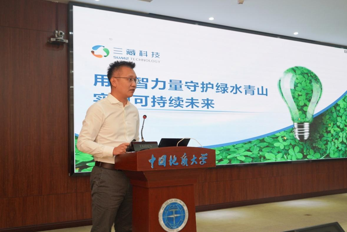 宣传片《卓越之路》,了解学院的发展历程。随后,宋光宇介绍了三藏科技创办以来的发展历程和以数智力量守护绿水青山的愿景,重点突出了在环保、双碳、能源领域的数字化、智能化应用研发和咨询服务领域的业务拓展与创新成绩。