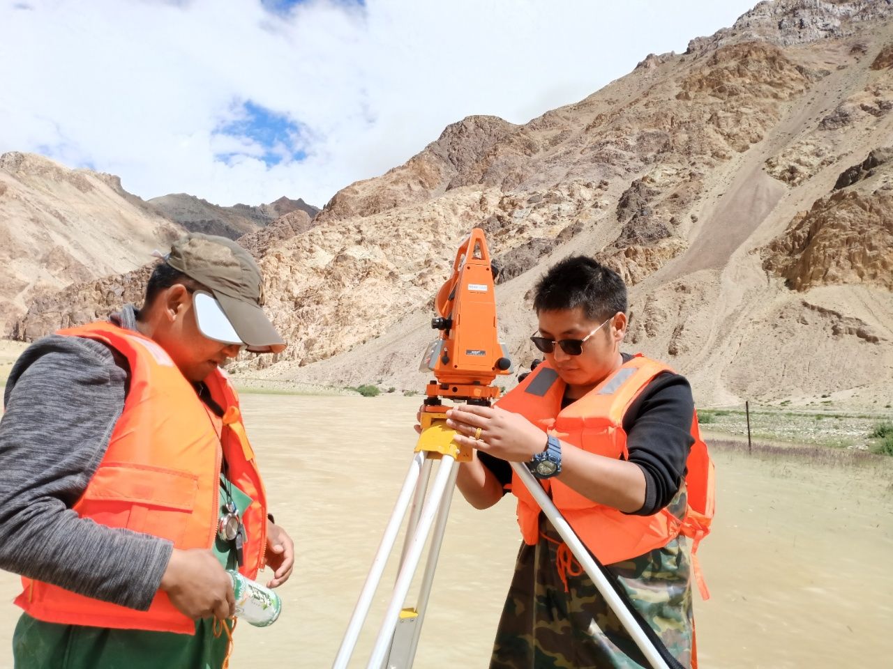 扎西南美(右)在狮泉河上浮标测流