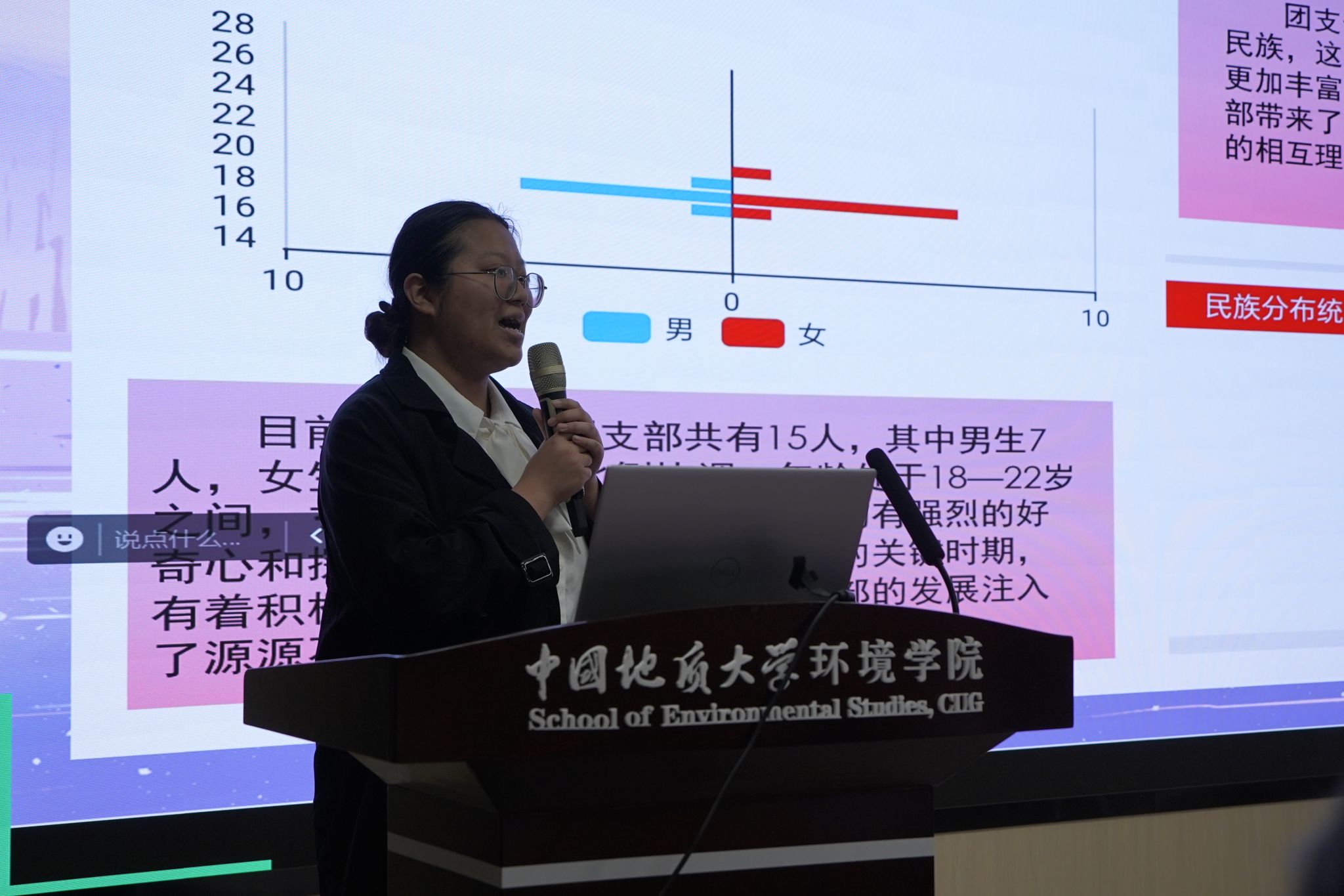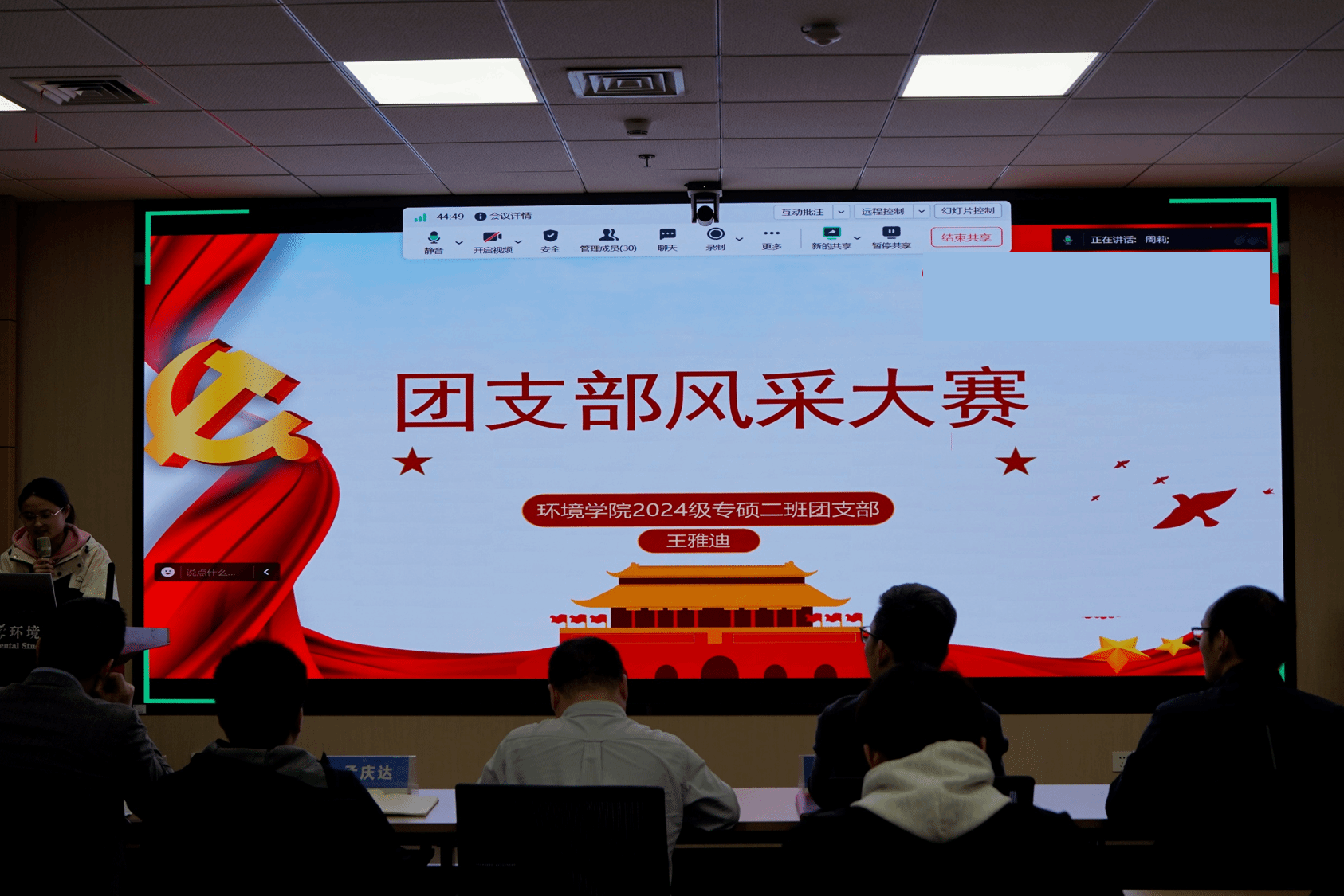 姜明敏总结讲话。他对各团支部的风采展示表示肯定,并重点阐释群团组织政治性、先进性、群众性的内涵意蕴及现实要求。他指出,基层团支部是共青团工作的“神经末梢”,要做到党有号召、团有行动,为学院高质量发展凝聚、培养和输送优秀青年学生,通过强引领、优服务使学院团组织同青年学生的联系更加紧密。他强调,基层团支部要联结上级党团组织、团结身边广大同学,切实发挥好师生之间的桥梁纽带的作用。他希望在学院团委的带领下,各团支部携手努力、追求卓越,引领团员青年在奋斗的年纪释放青春、绽放才华,成长为更有责任“红”、更有底色“专”、更加多维“能”、更加全面“优”的新时代生态环保铁军。