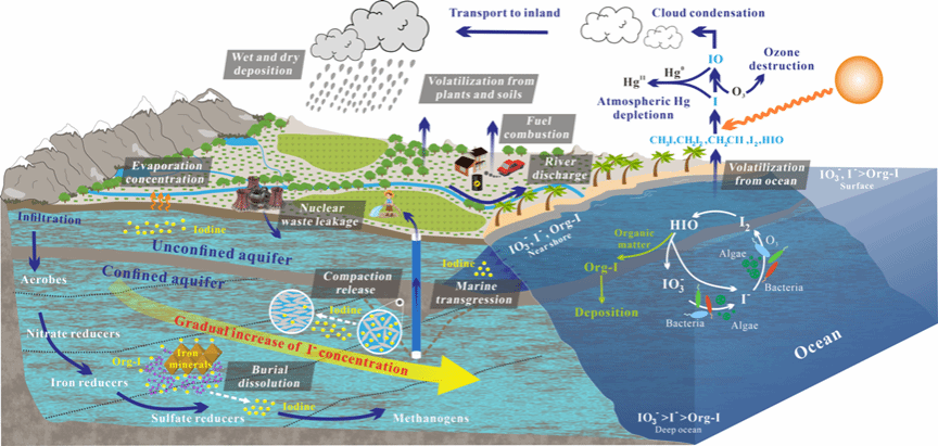 鉴于碘的亲生物特性,生物成因的陆相源/海相源的有机质和与有机质结合铁矿物是含水层中碘的主要物源(图2)。相对于内陆盆地,滨海地区浅层和深层地下水会因海侵或海水入侵直接受到海相碘的影响(海洋是地球上最大的碘库)。地下水系统中碘主要以碘酸根(IO3−)、碘离子(I−)和有机碘(OI)形态存在,其中水相中以I−为主,而固相沉积物中则以IO3−和OI为主。众多水文地质过程和生物地球化学过程能够促进含水层中沉积相的碘向地下水中释放,从而形成高碘地下水。