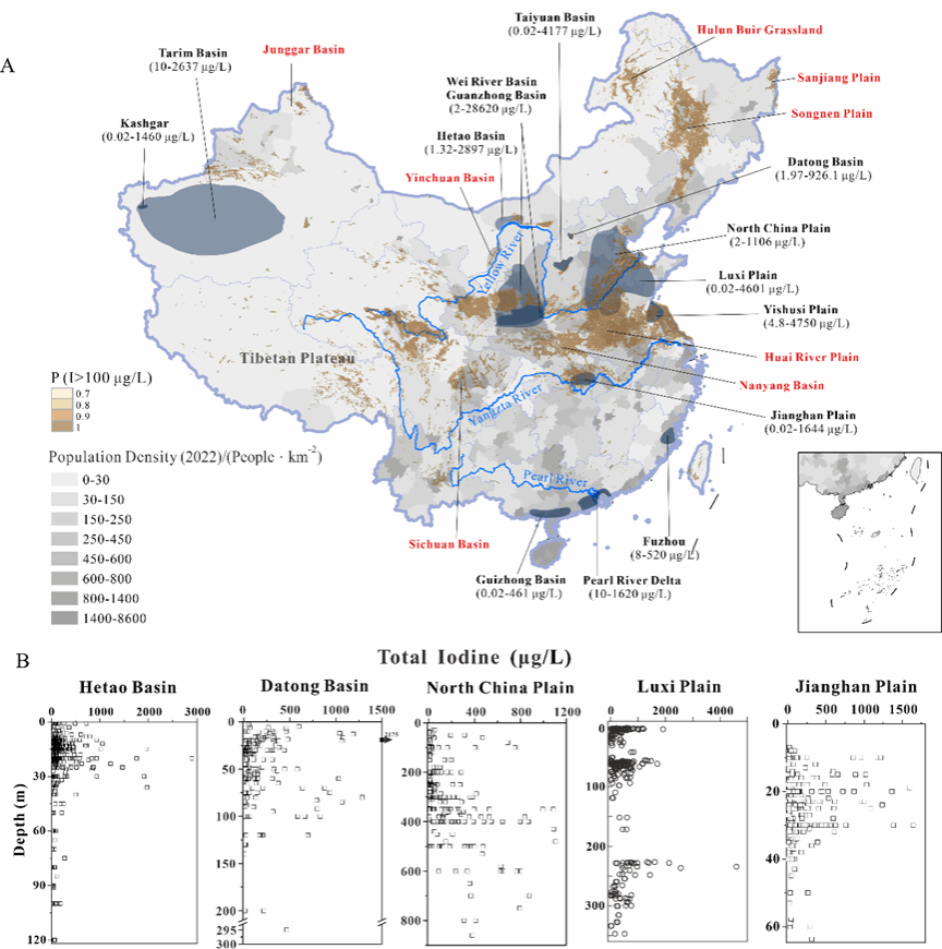 图1 中国高碘地下水的分布(蓝色斑块与黑色字体)和预测(棕色斑块与红色字体)(A),以及河套盆地、大同盆地、华北平原、鲁西平原和江汉平原地下水中碘浓度垂向分布图(B)。