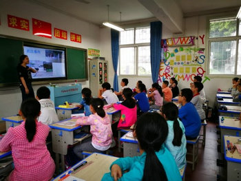 (左图志愿者为小学生发放小礼物,右图为志愿者和小学生合影)