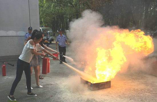 消防科李洋副科长为师生做了“预防为主,防消结合”的主题宣传。李洋详细地讲解了安全用电、火灾报警、火场自救以及灭火器使用等四个方面的注意事项,介绍了手提式灭火器的配置情况及使用方法,强调了不同灭火器的适用范围和使用时注意事项。在场师生对干粉灭火器和二氧化碳灭火器进行了灭火演练。