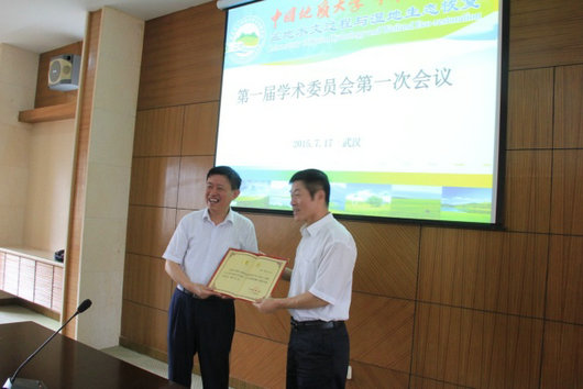 在“盆地水文过程与湿地生态恢复”第一届学术委员会第一次会议上校党委书记郝翔为吴振斌教授颁发聘书