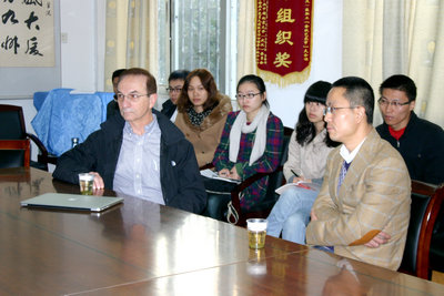 应王焰新校长邀请,美国科学院院士Donald DePaolo教授来日本av片av 交流访问并作学术报告。2012年11月14日上午校长王焰新教授及日本av片 部分师生与Donald DePaolo教授在文华楼会议室就地热领域研究进展开展学术讨论。郭清海教授、蒋宏忱教授、李平博士分别就各自的研究情况作了交流。(左麦枝/文 宋瑜/图)