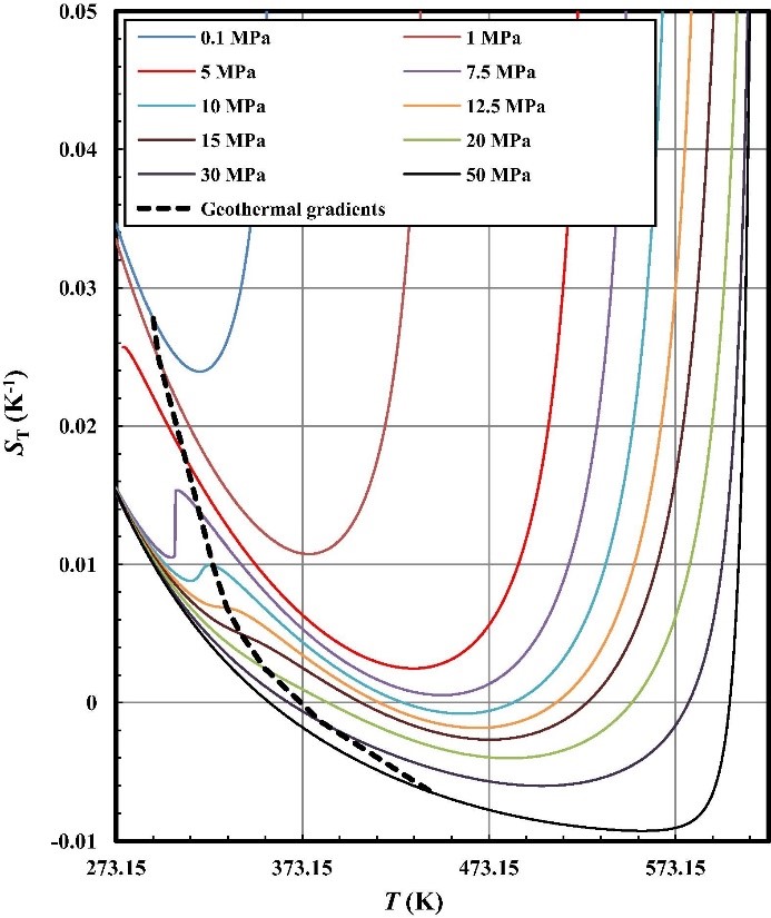 Fig. 2. Soret coefficient of the CO2 in water as a function of the temperature and the pressure. The bold dashed line represents temperature-dependent soret coefficient under a typical geothermal gradients, assuming the surface temperature is around 293 K and the geothermal gradients are 30 K/km.