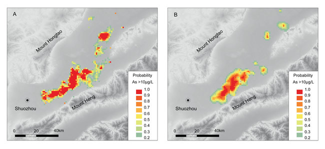 图3. 大同盆地高砷地下水(As>10μg/L)预测概率分布(A)和实际概率分布(B)