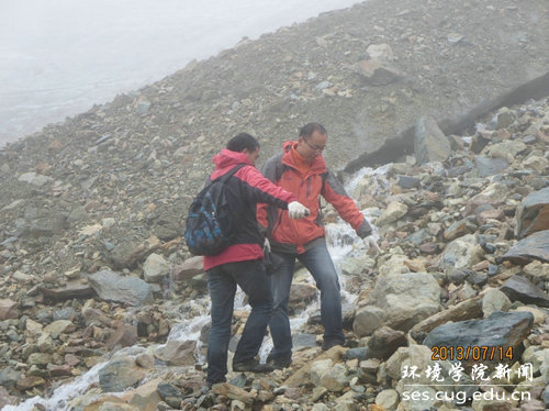 孙老师和学生一起在冰川调查取样