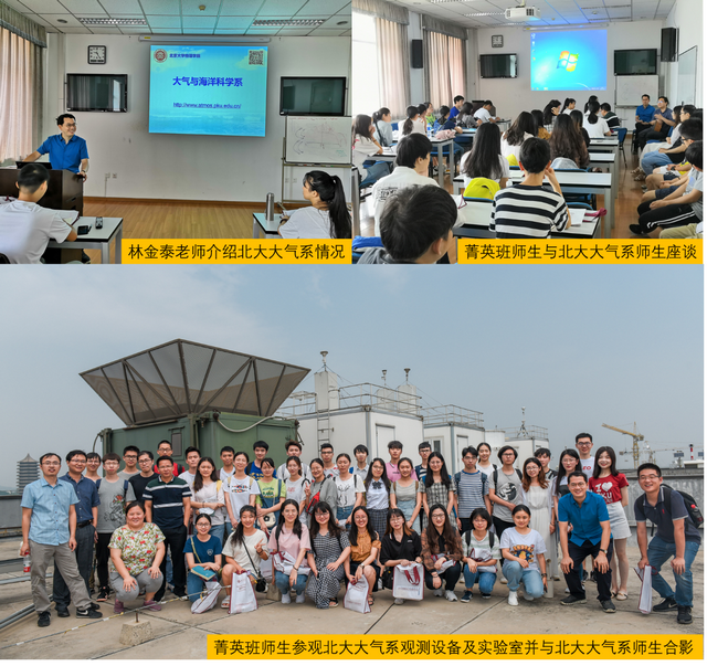7月13日,在北京大学大气与海洋科学系(北大大气系)林金泰老师的协调下,大气科学菁英班师生参观了北大大气系,并与北大大气系林金泰老师、张霖老师以及研究生和本科生代表座谈。座谈会在师生共同观看了北大大气系90周年系庆视频之后开始。座谈会上林金泰老师首先介绍了北大大气系的基本情况,之后由各位研究生代表分别介绍了自己所在课题组的情况。随后,由本科生代表介绍了北大大气系本科课程学习情况和参与科研的情况。之后,北大大气系林金泰和张霖老师表示,鼓励本科生参与科研,重在参与,主要目的是对学生将来的职业规划有帮助,而非为了发表文章。座谈会在非常愉快的氛围中进行。座谈会后,在北大大气系研究生和本科生的引导下,菁英班师生愉快地参观了北大校园。