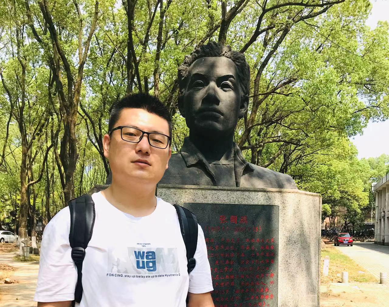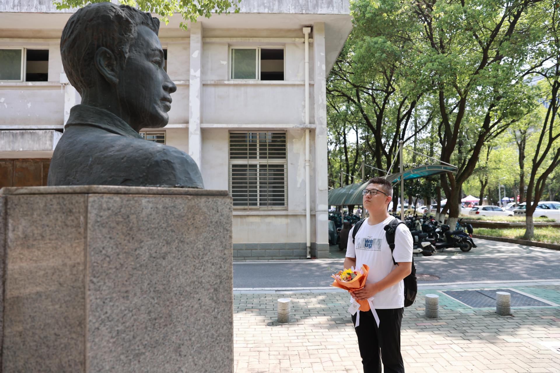 (武汉)张国旗雕像前,进行祭扫活动,第一次面对面看着父亲的雕像,张云飞落泪了。他突然意识到,不该满足现有的小日子,觉得应该做点什么。经过一番深思,他做出决定:一边工作一边备考,力争考上父亲的母校,攻读水文地质学专业研究生。