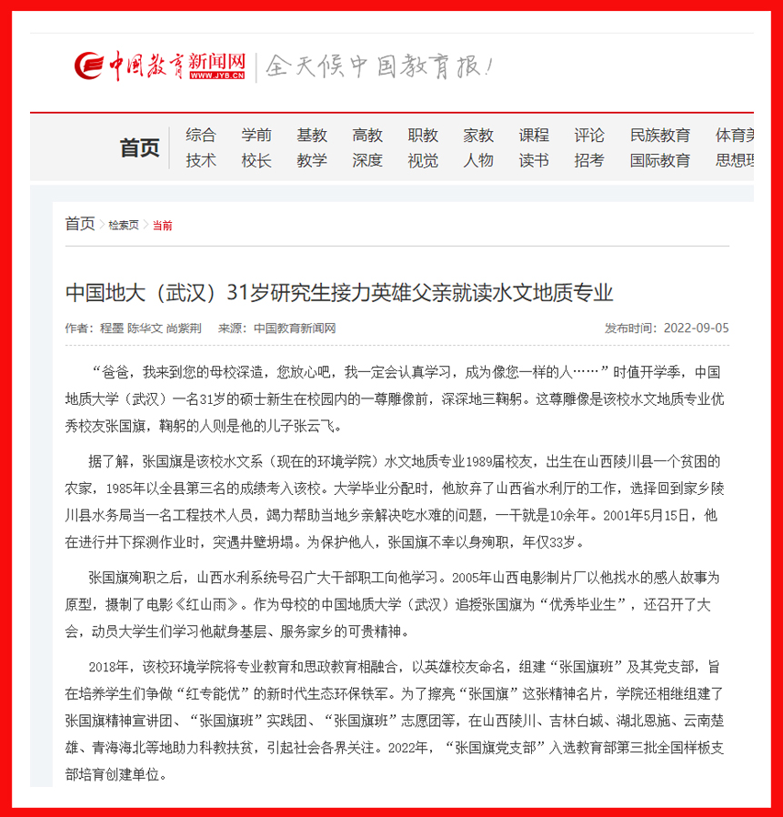 据张云飞介绍,张国旗殉职时,自己才10岁,“向张国旗学习”成为幼年的他耳边听到最多的一句话。2010年高考时,张云飞发挥失常,与父亲的母校失之交臂,被云南一所大学的地理信息系统专业录取。毕业后工作期间,看到“张国旗班”建设的系列新闻报道后,张云飞下定决心考研,继续攻读水文地质学专业研究生。2022年研究生入学考试中,他过关斩将,成功被日本av片
