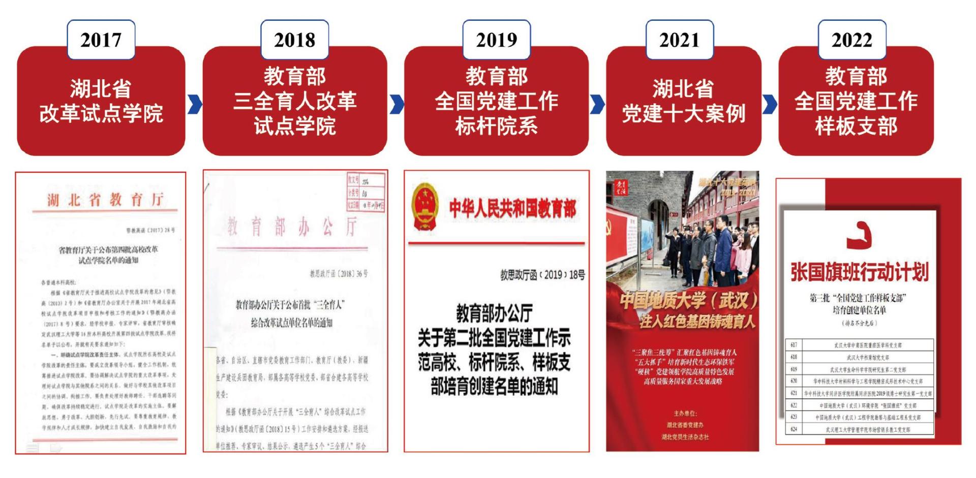 调研。2022年5月,湖北省高校党建工作推进会定点考察学院,湖北省高工委专职副书记张幸平莅临指导;2021年12月,时任湖北省委常委、组织部长李荣灿来校调研专题听取学院工作汇报;2019年10月,教育部直属高校“不忘初心、牢记使命”主题教育第八巡回指导组组长黄健柏一行来学院调研指导;2018年12月,时任湖北省委常委、宣传部部长、高校工委书记王艳玲来学院调研党建思政工作,均给予高度评价和充分肯定。《人民日报》、中央电视台、新华网、《光明日报》《经济日报》《中国教育报》《中国自然资源报》《中国科学报》《中国青年报》《中国气象报》《湖北日报》、湖北卫视、武汉电视台等媒体对学院进行宣传报道。