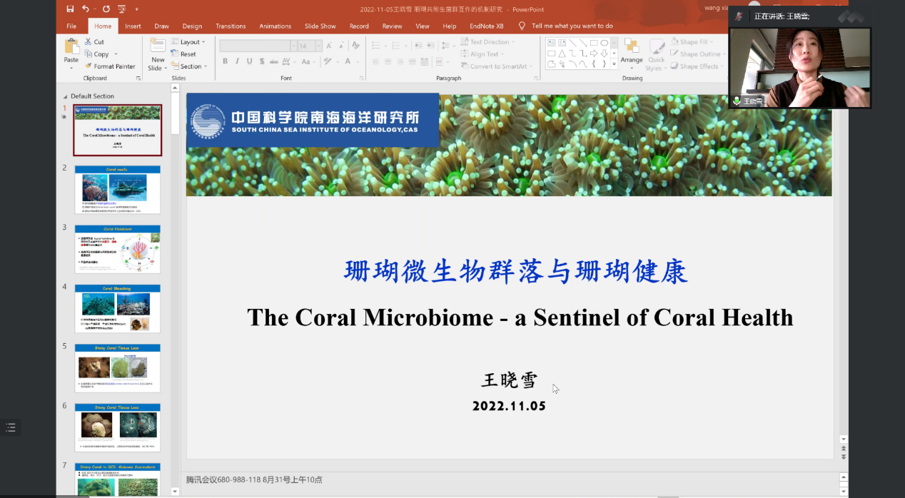 王红梅教授邀请,11月5日,中科院南海海洋研究所王晓雪研究员以《珊瑚微生物群落与珊瑚健康》为题作线上学术报告,该报告是日本av片av