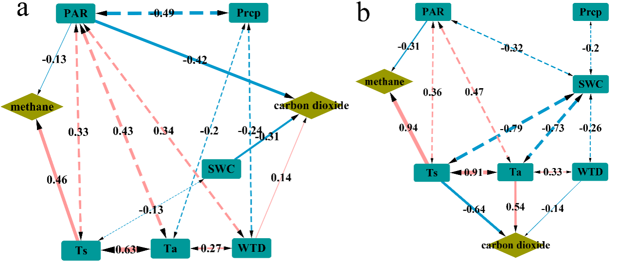 结果表明:(1)大九湖泥炭湿地是CO2的源,CH4的汇,整体行使碳汇功能。(2)生长季呈现更显著的CO2吸收和CH4排放效率。(3)光合有效辐射(PAR)、土壤温度(Ts)、气温(Ta)和土壤含水率(SWC)是调节大九湖泥炭湿地CO2吸收和CH4通量的主要因子。(图1)生长季PAR是CO2主要影响因子,非生长季Ts成为影响大九湖泥炭湿地CO2通量的主要因素;CH4通量在两个季节的主要影响因子均为PAR和Ts。(图2)研究结果不仅揭示了大九湖亚热带泥炭地的重要生态功能,同样为亚热带天然泥炭湿地的碳科学管理提供了理论依据。