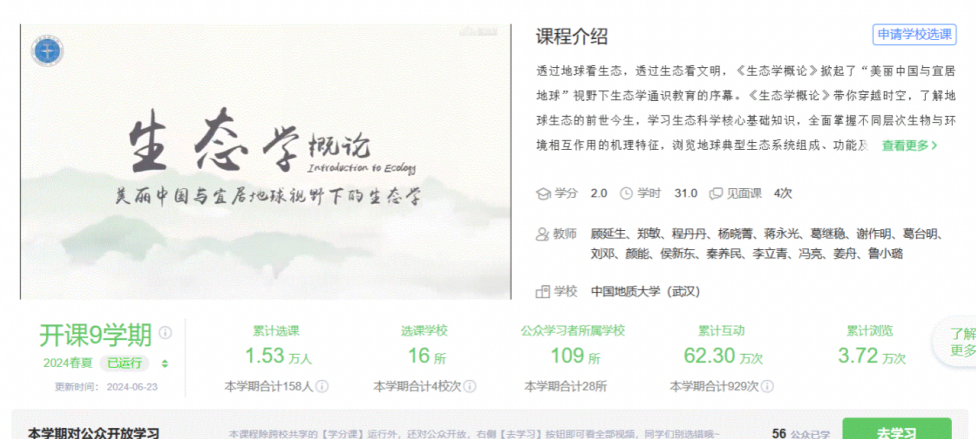 为了服务日本av片av “美丽中国、宜居地球”战略规划与人才培养目标,自2019年秋季开始,教学团队(16人)率先给全校本科生开设《生态学概论》线上线下通识必修课。目前选课人数超22000人(含校外2500多人),累计选课学校16所。团队注重教学改革与创新,强化过程考核、增加生态价值等培养,促进学生全面发展;侧重课程内容的重构,体现生态与地学、环境科学的交叉;将思政元素有机融合于课程教学,讲好中国故事,弘扬人文与科学精神;丰富的课外实践活动不仅增强了大学生生态热情,而且促进了生态素养的形成。