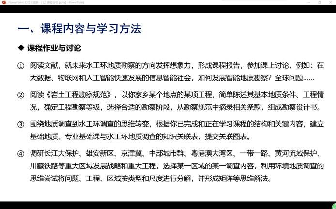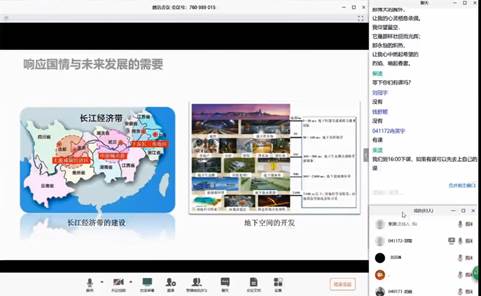 第一节课,学习水工环地质勘查的发展历史,介绍了我国区域发展战略和重大工程中遇到的专业难题。为了使同学们能够了解本专业的工作现状,在线授课时连线工作在中国铁路建设集团第一勘察设计院的校友罗锋,由他与学生们分享了目前正在参与川藏铁路工程勘察过程中的感悟,鼓励学生们关心国家需求、行业动态,激发学习兴趣。