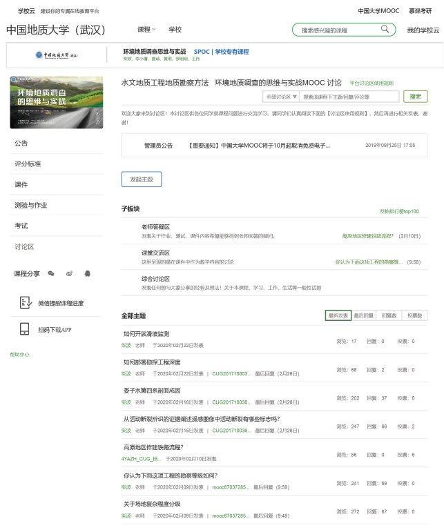 1月30日,学校发布了2020年春调整本科教学计划的通知,随之,纷繁复杂的在线教学平台及学习资料接踵而至,课程组也忙碌了起来,对学习通、慕课程、腾讯课堂、华为微课、群共享和腾讯会议室等多种在线教学工具进行了学习和讨论。考虑到前期在爱课程网站上建设有《环境地质调查思维与实战》的MOOC,但该课程集中在区域环境地质调查的知识点,缺少针对建筑场地、路桥工程等岩土工程勘察的相关知识。经过比较后,确定依托MOOC开设《水文地质工程地质勘察方法》专属SPOC课程,可以为本校学生添加缺少的教学内容。这样就形成了SPOC在线学习,网络直播(SPOC课内直播或腾讯会议室直播)导学、讨论和课下作业相结合的教学方案。在SPOC上为每一知识点都添加了足够的随堂练习及讨论题,作为课程需要掌握的基础知识。在导学环节,重点讲授基础地质调查、水工环地质调查和岩土工程勘察中思维转变的方法。课下需完成单元测试和四次课程大作业。