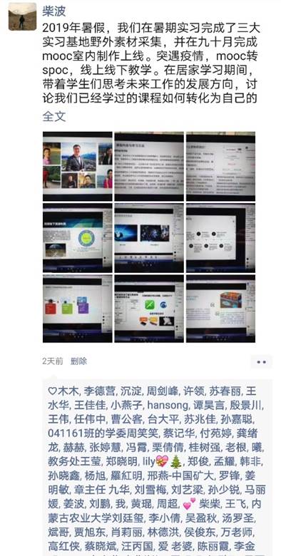 “2019年暑期,我们完成了三大实习基地野外素材采集,并在九、十月完成MOOC室内制作上线。突遇疫情,MOOC转SPOC实现线上线下教学。在居家学习期间,带着学生们思考未来工作的发展方向,讨论已经学过的课程如何转化为自己的知识,了解规矩和规则的重要性。昨天第一次作业汇报,一开始同学们很腼腆,第一个汇报后气氛热闹起来,大数据,人工智能,物联网,面向深地、深空、深海、深蓝的探测,勘查机器人,全球地质大数据库,同学们都有所提及,讨论也十分热烈。时常想,我们教的很多知识、技能可能已经远落后于时代,但能够独立思考,善于学习,那依然可以引领发展。期望每个学生都能收获属于自己的知识,理论、方法和技术就在那,只有遇到问题在自己脑海中生成其关联,并付诸于行动,它们才真正属于你”