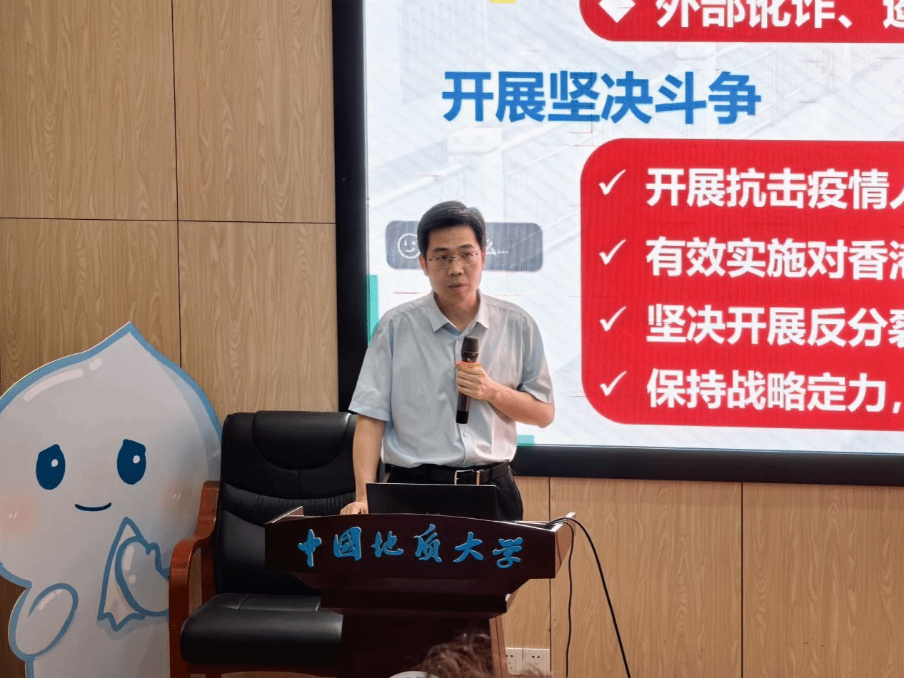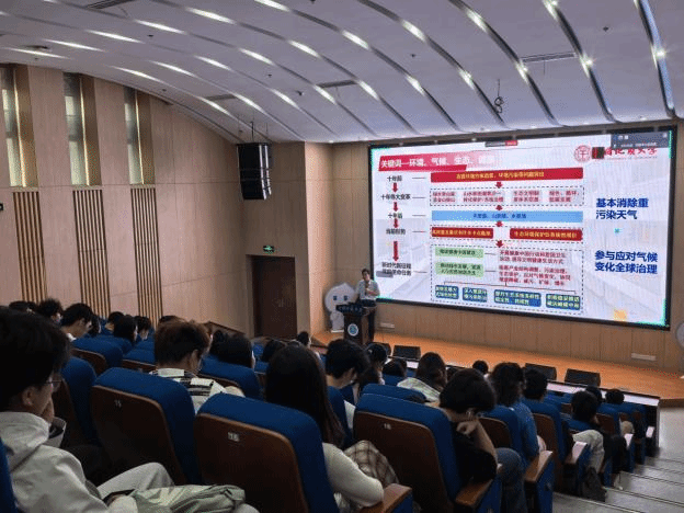 他带领大家学习习近平生态文明思想中关于大气污染和气候变化的相关内容。他从大气污染的定义、历史公害事件、评价标准、污染源及效应等方面指出PM2.5控制等重点任务,强调协同防控的重要性。从明确气候变化的定义与事实,解读碳达峰、碳中和概念,分析CO₂与大气污染物同根同源关系,指出协同推进减污降碳的依据。他结合大气科学专业,以长江中游城市群为例,分析协同推进降碳减污的背景以及存在的问题,通过介绍大气污染防控经验和推进降碳减污战略的区域生动实践,勉励大家要夯实专业基础,永葆报国情怀,充分利用自己的专业技术能力,推进生态环境综合治理工作。