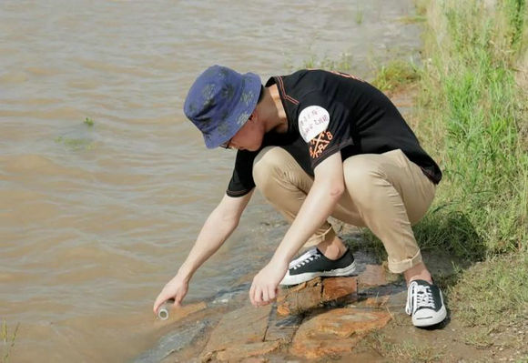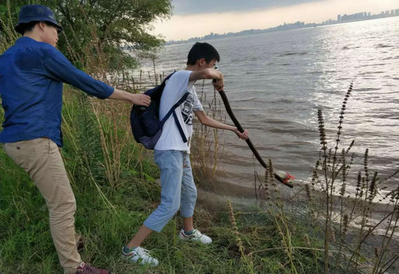 14日,实践队的大学生们根据昨天实际的考察情况,来到了长江边的取样地点。为了确保采水样过程的安全性,解决长江岸边可能存在的安全隐患,他们利用取点现场的长木棍,手动做了一个取水样的道具,使取水的过程更具有安全保证。