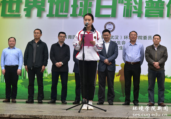 附属学校学生代表胡若铱发言。她说,珍爱地球、从小做起,从现在起,做一名地球小卫士。