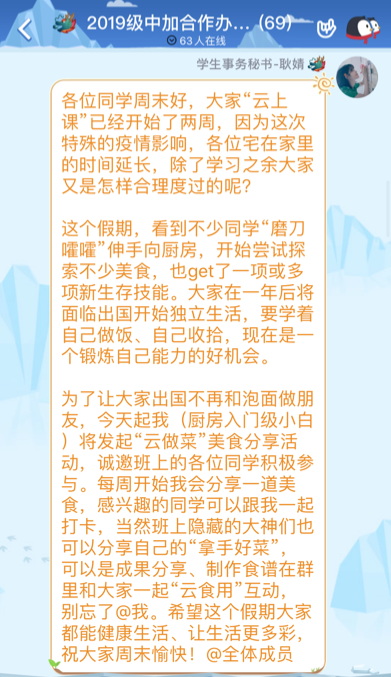 云端相会,心灵相通。为了使“居家隔离”的学生更加科学合理地“宅在家”,各班级充分利用网络平台为同学创造“面对面”交流机会。本科班级共开展网络班会27次,中加合作办学班开展线上“云做菜”美食分享活动,鼓励同学们充分利用在家的时间,掌握基本家务的生活技能,做到“高级宅”。043181班学生开展“心相聚·战疫情”线上心理主题班会,向同学们介绍新冠肺炎的症状及识别、错误舆论澄清等相关知识,缓解焦虑情绪,保持健康阳光的积极心态。
