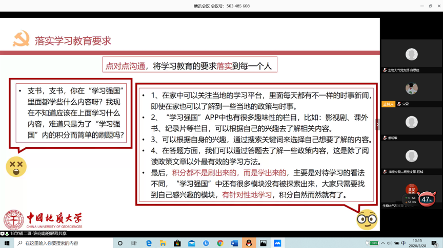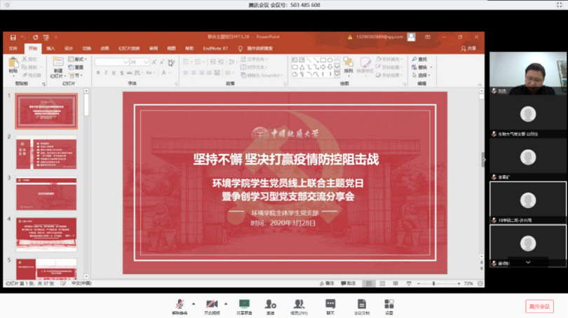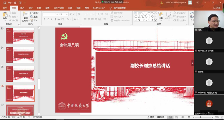 学生党员、地大青年党员应有的担当精神。随后,他就如何加强党支部建设提出要求。他希望各支部认真学习《中共教育部党组关于高校党组织“对标争先”建设计划的实施意见》,在教育党员、管理党员、监督党员、组织师生、宣传师生、凝聚师生、服务师生方面下功夫,积极建设样板党支部。对照具体要求,查找短板弱项,分析问题原因,强化整改落实,解决突出问题。他向党员同志们提问并希望大家做出进一步思考:面对此次疫情,青年党员要明确如何看待人民、党员应该有怎样的人民观;如何看待中国共产党的领导和党中央的决策部署;如何看待中国特色社会主义制度优势;如何看待一个党员的责任和使命。最后,他提醒党员同志要树牢“四个意识”,坚定“四个自信”,做到“两个维护”,只有坚持党的领导,才能实现伟大的中国梦。