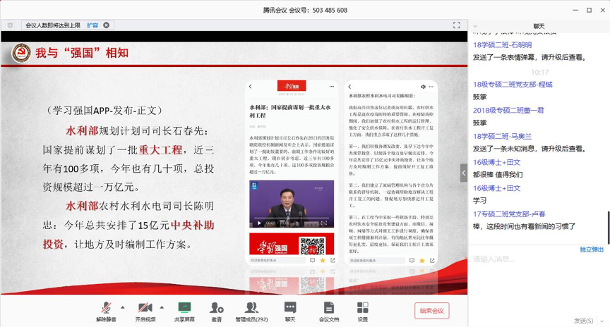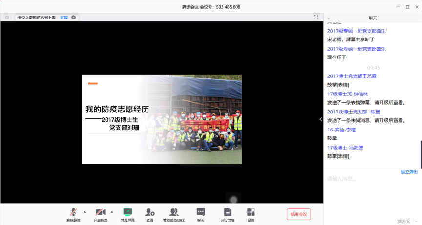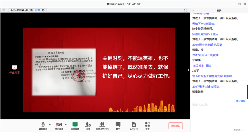 参会师生党员在腾讯会议室聊天框热烈讨论