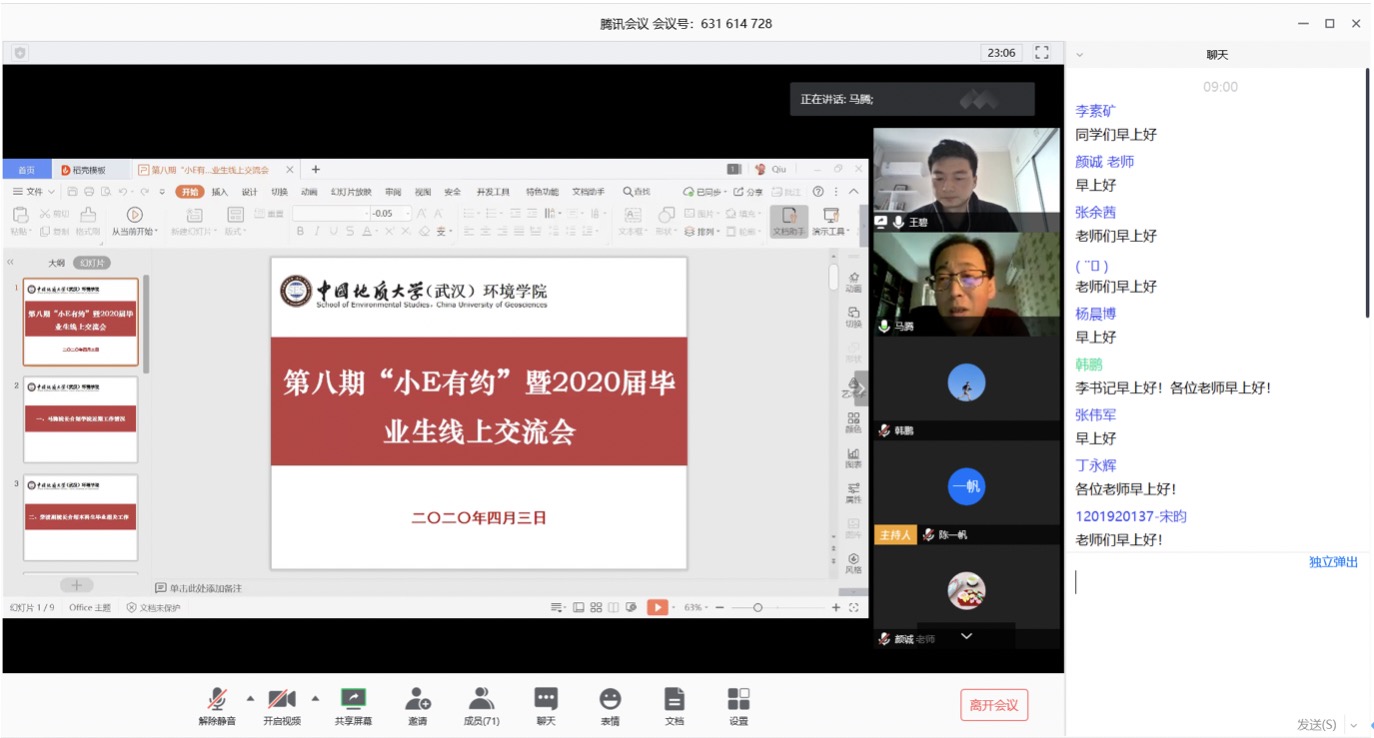 于4月3日上午举行第八期“小E有约”暨2020届毕业生线上交流会。学院党委书记李素矿,院长马腾,副院长柴波、谢先军,党委副书记姜明敏、本科毕业班班主任、本研教学秘书、毕业年级辅导员及80余名本研毕业生代表参加交流会。