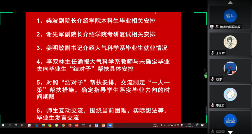 柴波介绍了学院毕业生毕业工作的安排,并对师生关心的毕业问题进行解答。他谈到,今年毕业答辩学院将采用线上答辩方式,答辩时间在6月初。他强调,广大毕业生一定要注意各项工作的时间节点,认真完成毕业论文,保证顺利毕业。他希望,大气科学系全体教师加强毕业论文的线上指导,加强与毕业生的交流沟通,详细掌握毕业生的毕业论文进展情况,帮助毕业生顺利毕业。