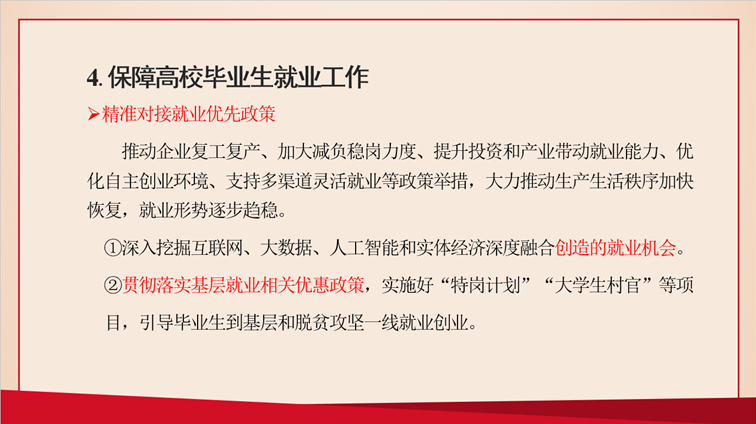袁淑卿同志为全体党员作主题为“岗位有保障,民生才托底——两会上看就业”的分享。袁淑卿同志从当前就业形势、青年对稳就业议题的期待、稳就业保就业、对于高校毕业生和农民工这两大重点群体的一些政策措施等几个方面阐述了两会上对就业的新政策。就业创业一直是两会上颇受关注的议题,今年在肺炎疫情影响下,就业话题更是受到广大就业创业者的高度关注。今年的政府报告聚焦“六稳”“六保”,其中稳就业和保就业兼具两者之首,在报告中被讲到39次。习近平总书记强调:“要实施好就业优先政策,根据就业形势变化调整政策力度,减负、稳岗、扩就业并举”。为优先稳就业保民生,今年的政府工作报告中提出三点重要要求:一是就业优先政策要全面强化;二是要稳住上亿市场主体;三是千方百计稳定和扩大就业,加强对重点群体就业支持,特别是高校毕业生和农民工。