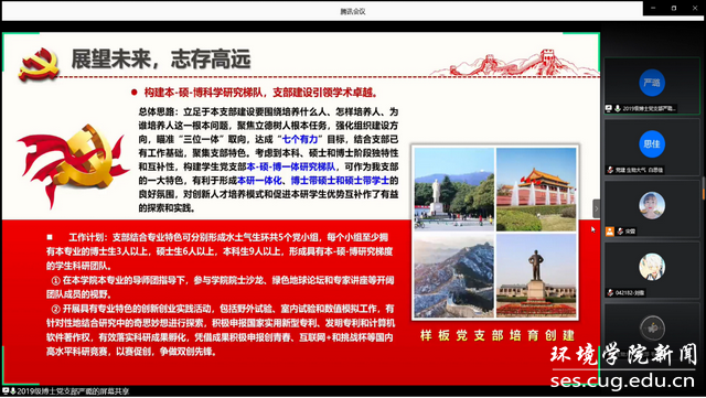 2019级博士研究生党支部书记严璐从支部基础建设、思想引领、绿色志愿服务、生态保护社会实践等多个方面进行了支部介绍,展示了“构建本-硕-博科学研究梯队,支部建设引领学术卓越”的支部特色。