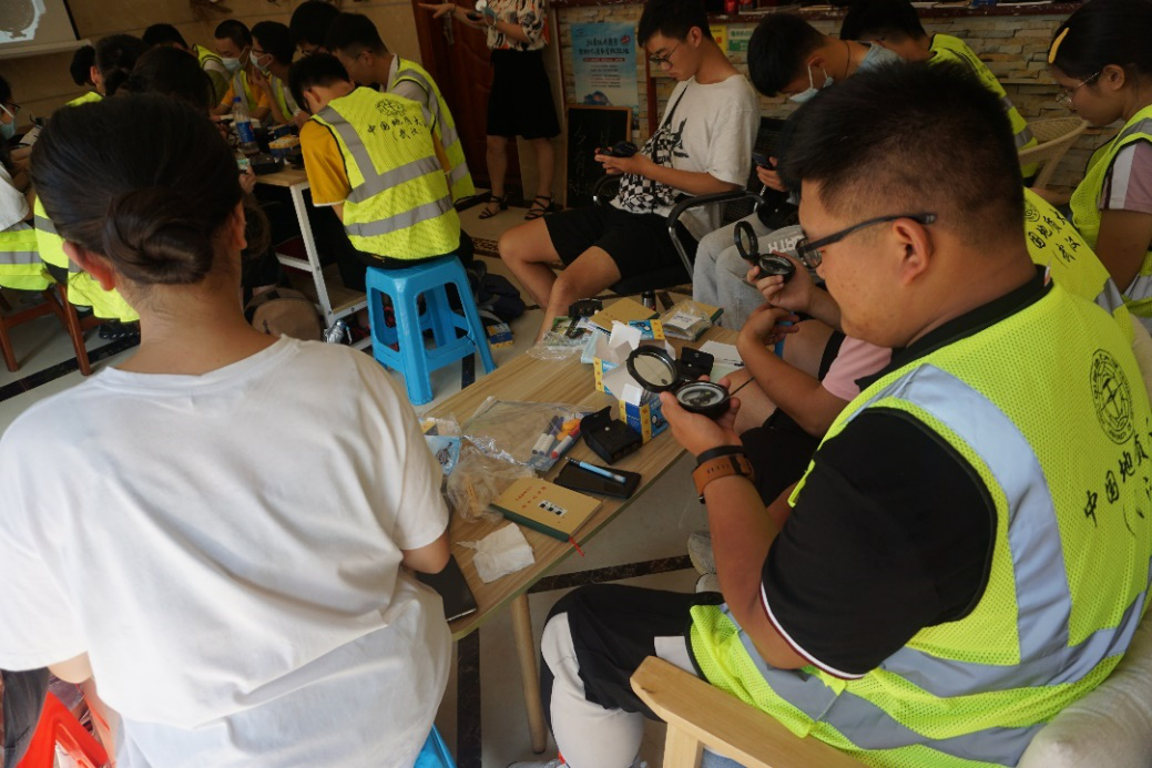 实习教学第一课在室内进行。邢新丽老师详细讲解了野簿记录方法,并就罗盘使用的方法进行针对性的指导。刘邓老师对丹霞山世界地质公园的区域地质背景进行了详细的讲解,并对《普通地质学》课程中相关知识点进行回顾,为野外实习做好充足的知识储备。