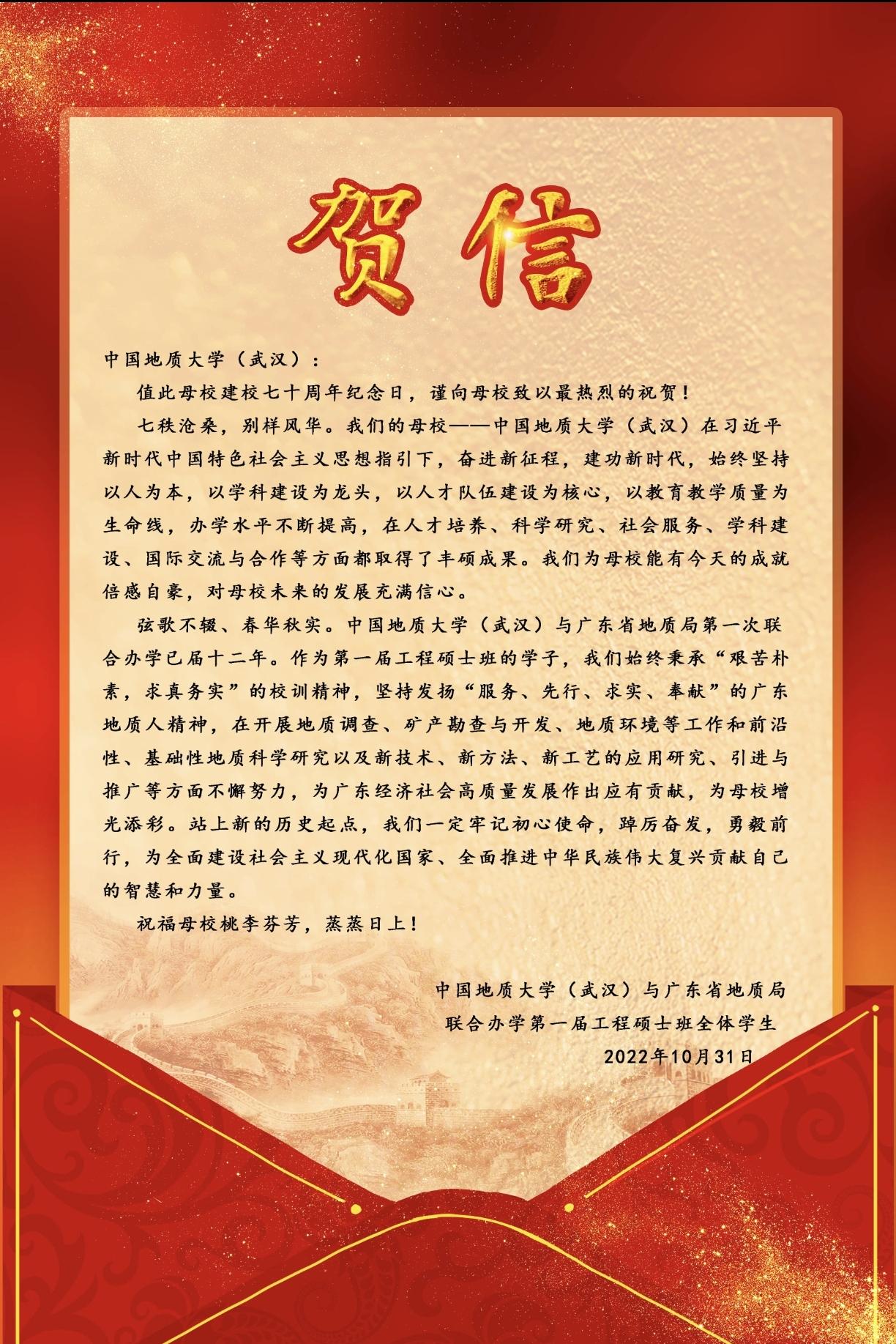 与广东省地质局联合办学第一届工程硕士班全体学生向母校发来七十周年校庆贺信。