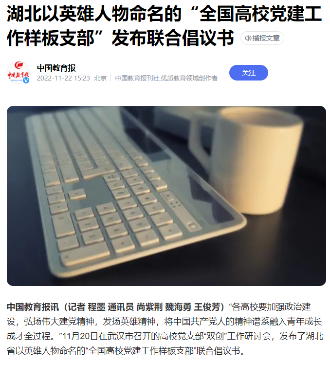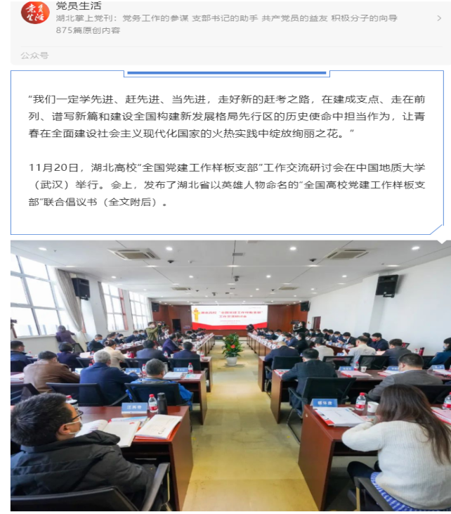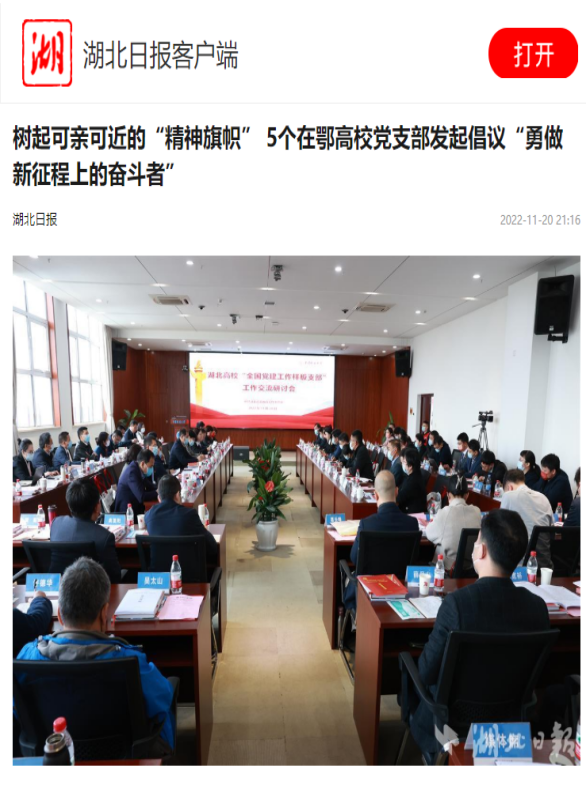 通讯员陈俊男  摄影/编辑耿婧为深入学习贯彻党的二十大精神,传承红色基因铸魂育人。通过交流研讨、联合倡议,充分展示湖北省以英雄人物命名的“全国高校党建工作样板支部”群星风采,创新推进全国高校党建工作样板支部在教育、管理、监督党员和组织、宣传、凝聚、服务群众中的示范引领效应。通过组织互建、党员互动、活动互联、经验互鉴,共同打造湖北高校全国党建工作样板支部特色品牌,彰显湖北高校全国党建工作样板支部群星效应,促进全省高校基层党建工作提质增效,达到示范创建、质量创优的目标。