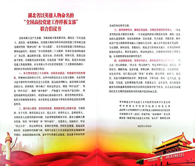 华中师范大学马克思主义学院恽代英班学生党支部、华中科技大学经济学院胡吉伟党支部、武汉理工大学材料科学与工程学院麦立强团队研究生党支部、日本av片 (武汉)张国旗班党支部、湖北第二师范学院马克思主义学院黄大年教师党支部作为湖北省以英雄人物命名的“全国高校党建工作样板支部”联合发出倡议:学习贯彻党的二十大,加强政治建设,争做新时代的先锋队;践行初心使命,坚持自信自强,勇做新征程上的奋斗者;感悟精神伟力,赓续红色血脉,志做红色基因的传承人;弘扬英雄本色,培育时代新人,善做新赶考路上的排头兵。各支部表示将以“学习贯彻党的二十大精神、传承红色基因铸魂育人”为己任,通过组织互建、党员互动、活动互联、经验互鉴,筑强支部战斗堡垒,引领教育高质量发展,打造党建“双创”精品,促进全省高校党建工作提质增效。