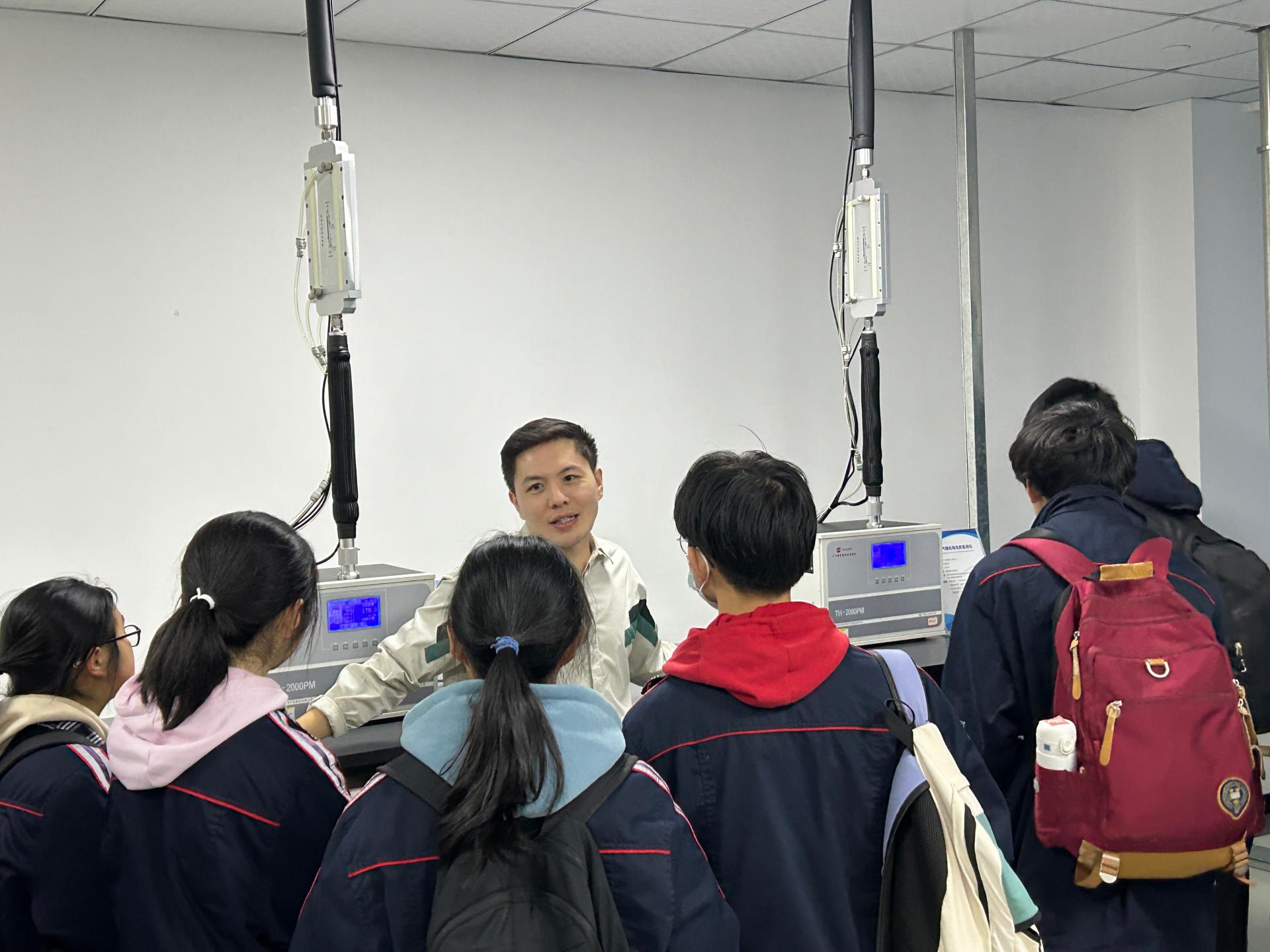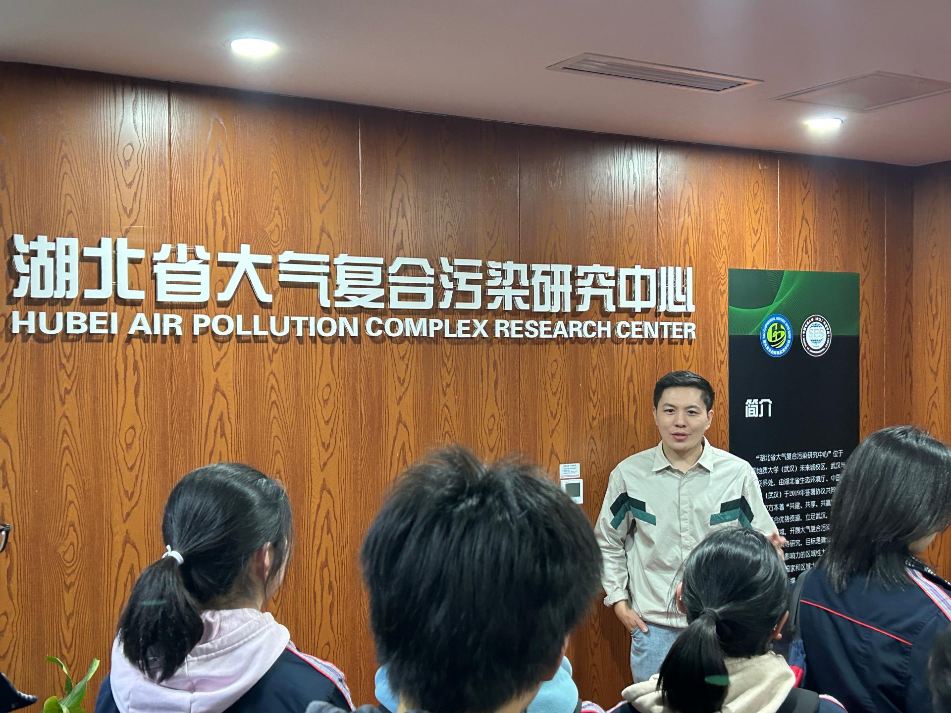在湖北省大气复合污染研究中心,吴剑老师介绍了大气污染的来源、大气污染的成因等,并带领师生参观了多参数观测实验室、大气颗粒物监测实验室。