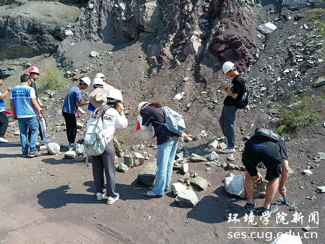 学生在观察岩石特征及地质灾害隐患点