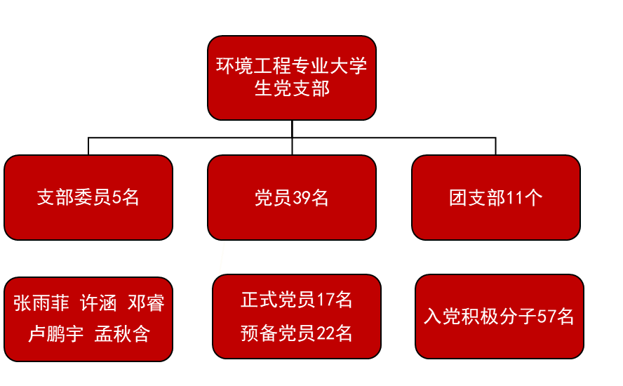 环境工程专业大学生党支部共有党员39名,其中正式党员17名,预备党员22名,下属团支部现有入党积极分子57名。支部书记由张雨菲同志担任,其他支部委员分别为邓睿、许涵、卢鹏宇和孟秋含。