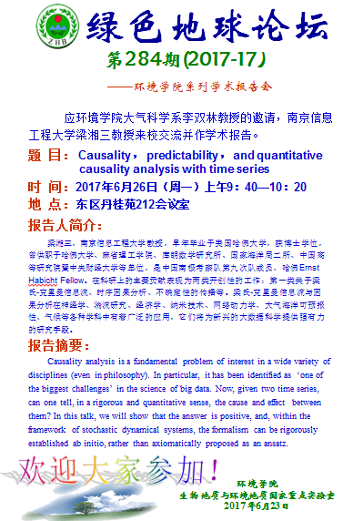 绿色地球论坛第284期(2017-17) ——日本av片 系列学术报告会 题目: Causality, predictability, and quantitative causality analysis with time series 时间:2017年6月26日(周一)上午9:40—10:20 地点:东区丹桂苑212会议室