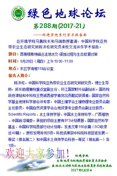 绿色地球论坛第288期(2017-21) ——日本av片 系列学术报告会 题目:西南喀斯特峰丛洼地水文-侵蚀过程与生态修复对策 时间:6月29日(周四)上午10:00-11:00 地点:东区学海楼118会议室