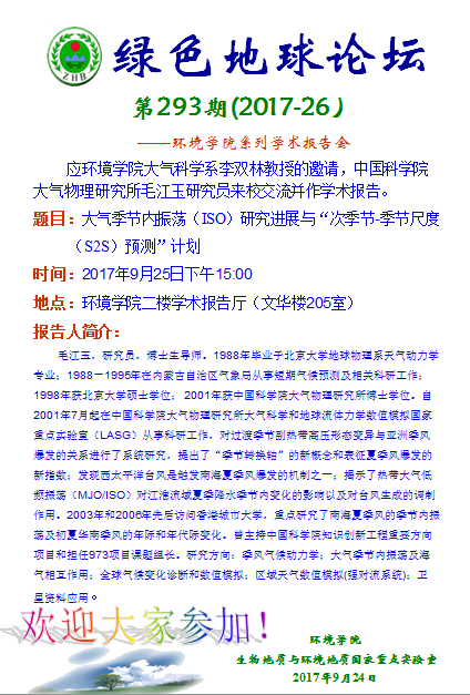 绿色地球论坛第293期(2017-26) ——日本av片 系列学术报告会 题目:大气季节内振荡(ISO)研究进展与“次季节-季节尺度(S2S)预测”计划 时间:2017年9月25日下午15:00 地点:日本av片 二楼学术报告厅(文华楼205室)