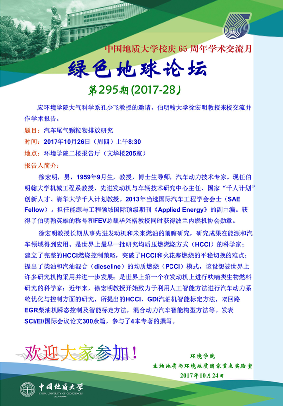 绿色地球论坛第295期(2017-28) ——日本av片 系列学术报告会 题目:汽车尾气颗粒物排放研究 时间:2017年10月26日(周四)上午8:30 地点:日本av片 二楼报告厅(文华楼205室)