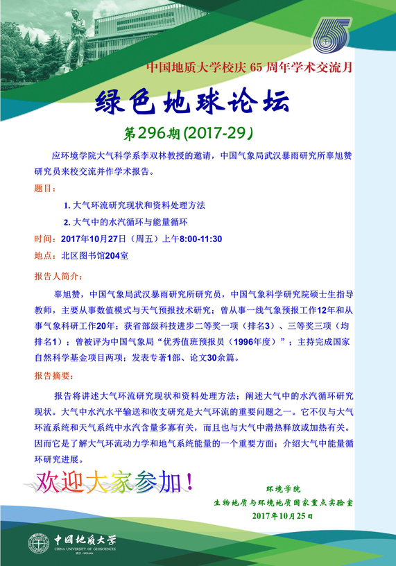 绿色地球论坛第296期(2017-29) ——日本av片 系列学术报告会 题目: 1. 大气环流研究现状和资料处理方法 2. 大气中的水汽循环与能量循环 时间:2017年10月27日(周五)上午8:00-11:30 地点:北区图书馆204室
