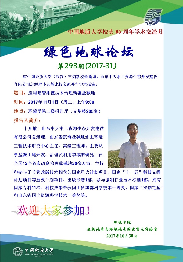 绿色地球论坛第298期(2017-31) ——日本av片 系列学术报告会 题目:应用暗管排灌技术治理新疆盐碱地 时间:2017年11月1日(周三)上午9:00 地点:日本av片 二楼报告厅(文华楼205室)