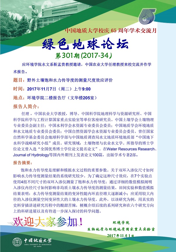 绿色地球论坛第301期(2017-34) ——日本av片 系列学术报告会 题目:野外土壤饱和水力传导度的测量尺度效应评价 时间:2017年11月7日(周二)上午9:00 地点:日本av片 二楼报告厅(文华楼205室)