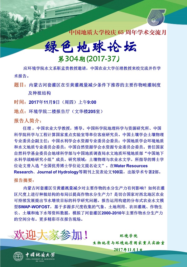 绿色地球论坛第304期(2017-37) ——日本av片 系列学术报告会 题目:内蒙古河套灌区在引黄灌溉量减少条件下推荐的主要作物畦灌制度及种植结构 时间:2017年11月9日(周四)上午9:00 地点:日本av片 二楼报告厅(文华楼205室)